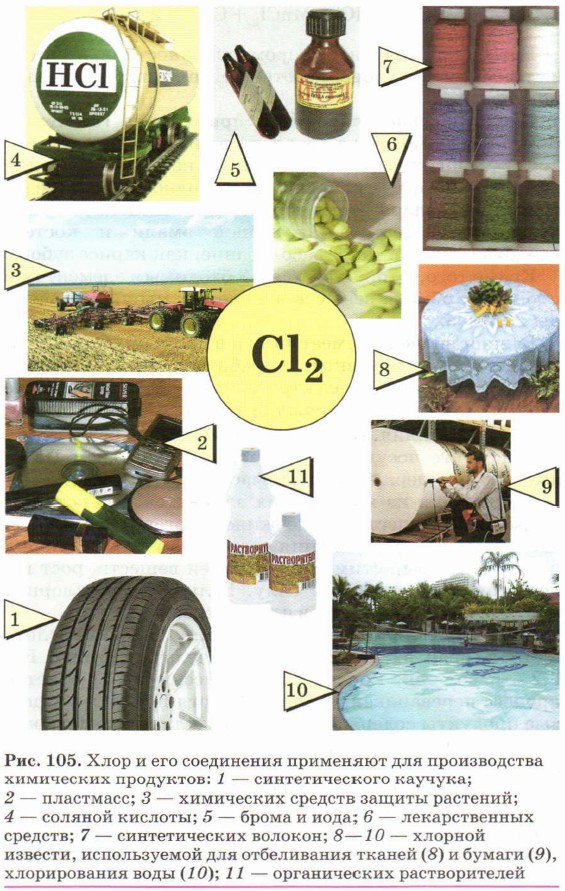 Бром и иод получают в промышленности по реакции вытеснения их хлором соответственно из бромидов и иодидов. Биологическое значение и применение галогенов. Фтор. Вы не могли не обратить внимания, что на этикетках многих марок зубных паст указывают содержание в них фтора — конечно, не свободного, а его соединений. Благодаря этому важному компоненту, участвующему в построении зубной эмали и костей, предотвращается такое заболевание, как кариес зубов. Кроме того, фтор является необходимым элементом в процессах обмена веществ в железах, мышцах и нервных клетках. Важное значение имеет фтор и в промышленном производстве, где основные потребители его — ядерная промышленность и электротехника. Его соединение Na3AlF6 (как его называют?) используют для производства алюминия. А в быту всё более широкое применение находит посуда с тефлоновым покрытием (тефлон — фторсодержащая пластмасса). Хлор. Один из химических элементов, без которых немыслимо существование живых организмов. Основная форма его поступления в организм — это хлорид натрия, который стимулирует обмен веществ, рост волос, придаёт бодрость и силу. Больше всего хлорида натрия NaCl содержится в плазме крови. Особую роль в пищеварении играет соляная кислота НСl, которая входит в состав желудочного сока. Без 0,2%-й соляной кислоты практически прекращается процесс переваривания пищи. И хотя почти все пищевые продукты содержат некоторое количество поваренной соли, человек вынужден добавлять к пище ежедневно около 20 г соли. По масштабам промышленного применения хлор намного превосходит все галогены. Хлор и его соединения необходимы для отбеливания льняных и хлопчатобумажных тканей, бумаги и т. д. (рис. 105). Особенно много его расходуют в органическом синтезе для производства пластмасс, каучуков, красителей и растворителей.