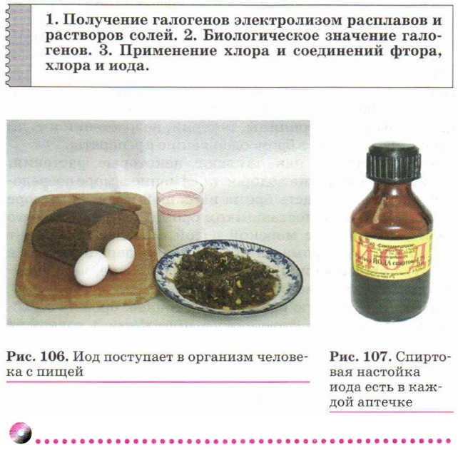 Иод. Последний из рассматриваемых нами галогенов — иод — элемент, без которого человек не может жить: недостаток его в воде и пище снижает выработку гормонов щитовидной железы и приводит к заболеванию эндемическим зобом. Гормоны щитовидной железы регулируют мышечную деятельность, работу сердца и мозга, а также аппетит, пищеварение. Иод поступает в организм вместе с водой, воздухом и пищей: хлебом, яйцами, молоком, водой, морской капустой (рис. 106). Спиртовой раствор иода (5—10%-й), называемый йодной настойкой, применяют для обработки ран (рис. 107). Иод входит в состав многих лекарств. Главными потребителями иода являются фармацевтическая и химическая промышленность, а также производство светочувствительных фотоматериалов. 1