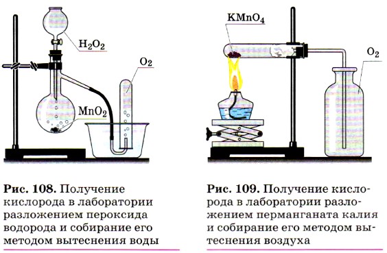 Кислород является родоначальником главной подгруппы VI группы (VIA группы) Периодической системы Д. И. Менделеева. Элементы этой подгруппы — кислород О, сера S, селен Se, теллур Те, полоний Ро — имеют общее название «халькогены», что означает «рождающие руды». (Вспомните, с какими рудами, содержащими кислород и серу, вы уже познакомились.) С некоторыми аспектами химии кислорода вы уже частично знакомы. Получение кислорода из пероксида водорода (рис. 108) и перманганата калия (рис. 109) вы разбирали в прошлом году (вспомните эти реакции). Вы теперь хорошо знакомы и с аллотропией кислорода, вам известно такое важное простое вещество, как озон. (Сравните ещё раз свойства кислорода O2 и озона O3, вспомните биологическое значение озона.) Кислород — самый распространённый элемент на нашей планете. Он входит в состав воды (88,9%), которая покрывает 2/3 поверхности земного шара, образуя его водную оболочку — гидросферу. Кислород — вторая по количеству и первая по значению для жизни составная часть воздушной оболочки Земли — атмосферы, где на его долю приходится 20,95% по объёму и 23,15% по массе. Кислород входит в состав многочисленных минералов твёрдой оболочки земной коры — литосферы: из каждых 100 атомов земной коры на долю кислорода приходится 58 атомов. Как вы уже знаете, кислород существует в форме O2. Это газ без цвета, запаха. В жидком состоянии имеет светло-голубую окраску, в твёрдом — синюю. В воде газообразный кислород растворим лучше, чем азот и водород. Кислород взаимодействует почти со всеми простыми веществами, кроме галогенов, благородных газов, золота и платиновых металлов. Например, энергично реагирует с металлами: щелочными, образуя оксид с литием Li2O и другие продукты, например пероксиды М2O2; с железом, образуя железную окалину Fe3O4; с алюминием (запишите соответствующие уравнения реакций, рассмотрите окислительно-восстановительные процессы).