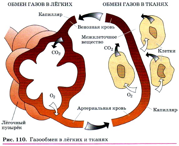 Высокая окислительная способность кислорода лежит в основе горения всех видов топлива. Кислород участвует и в процессах дыхания (рис. 110), медленного окисления различных веществ при обычной температуре. Эти процессы не менее важны, чем реакции горения. Так, медленное окисление пищи в нашем организме является источником энергии, за счёт которой живёт организм. Кислород для этой цели доставляется гемоглобином крови, который способен образовывать с ним непрочное соединение уже при комнатной температуре. Окисленный гемоглобин — оксигемогло- бин — доставляет во все ткани и клетки организма кислород, который окисляет белки, жиры и углеводы (составные части пищи), образуя при этом оксид углерода (IV) (углекислый газ) и воду и освобождая энергию, необходимую для деятельности организма.