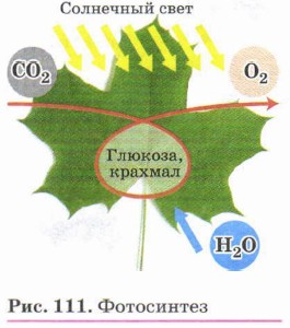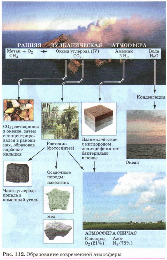 Исключительно важна роль кислорода в процессе дыхания человека и животных. Растения также поглощают атмосферный кислород. Но если в темноте идёт только процесс поглощения растениями кислорода, то на свету протекает ещё один противоположный ему процесс — фотосинтез (рис. 111), в результате которого растения поглощают углекислый газ и выделяют кислород. Так как процесс фотосинтеза идёт более интенсивно, то в итоге на свету растения выделяют гораздо больше кислорода, чем поглощают его при дыхании. Таким образом, содержание свободного кислорода Земли сохраняется благодаря жизнедеятельности зелёных растений, хотя изначально атмосфера нашей планеты была другой. Рисунок 112 показывает историю возникновения современной атмосферы Земли.