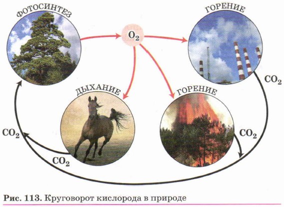 Круговорот кислорода в природе иллюстрирует рисунок 113. Повторим ещё раз, что в промышленности кислород получают из жидкого воздуха, а в лаборатории — разложением пероксида водорода Н2O2 в присутствии катализатора — оксида марганца (IV) МnO2, а также разложением перманганата калия КМпO4 при нагревании.