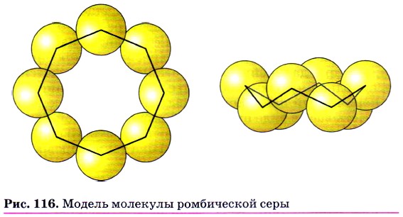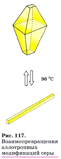 Сера — простое вещество. Для серы, как и для кислорода, характерна аллотропия. Известно много модификаций серы с циклическим или линейным строением молекул различного состава. Наиболее устойчива модификация, известная под названием ромбической серы, состоящая из молекул S8 (рис. 116). Её кристаллы имеют вид октаэдров со срезанными углами. Они окрашены в лимонно-жёлтый цвет и полупрозрачны, температура плавления 112,8 °С. В эту модификацию при комнатной температуре превращаются все другие модификации. Известно, например, что при кристаллизации из расплава сначала получается моноклинная сера (игольчатые кристаллы, температура плавления 119,3 °С), которая затем переходит в ромбическую (рис. 117). При нагревании кусочков серы в пробирке она плавится, превращаясь в жидкость жёлтого цвета. При температуре около 160 °С жидкая сера начинает темнеть и становится настолько густой и вязкой, что даже не выливается из пробирки, однако при дальнейшем нагревании превращается в легкоподвижную жидкость, но сохраняет прежний тёмно-коричневый цвет. Если её вылить в холодную воду, она застывает в виде прозрачной резинообразной массы. Это пластическая сера. Её можно получить и в виде нитей. Однако через несколько дней она также превращается в ромбическую серу. Сера не растворяется в воде. Кристаллы серы в воде тонут, а вот порошок плавает на поверхности воды, так как мелкие кристаллики серы водой не смачиваются и поддерживаются на плаву мелкими пузырьками воздуха. Это процесс флотации. Сера малорастворима в этиловом спирте и диэтиловом эфире, хорошо растворяется в сероуглероде. При обычных условиях сера реагирует со всеми щелочными и щёлочноземельными металлами, медью, ртутью, серебром, например: