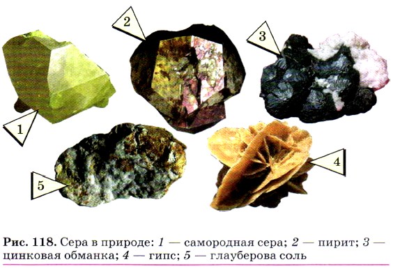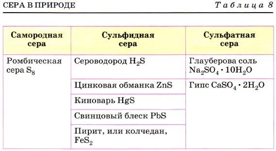 В природе сера встречается в трёх формах: самородная, сульфидная и сульфатная (рис. 118, табл. 8).