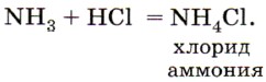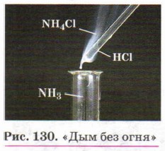 Аммиак взаимодействует с кислотами, образуя соли аммония. Это взаимодействие можно наблюдать в следующем опыте: стеклянную палочку или стакан, смоченные раствором аммиака, поднести к другой палочке или стакану, смоченным соляной кислотой, — появится густой белый дым (рис. 130):