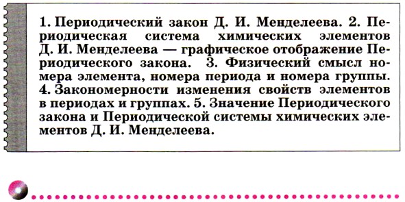 Периодичность в изменении свойств элементов и их соединений объясняется периодической повторяемостью в строении внешних энергетических уровней их атомов. Именно число энергетических уровней, общее число расположенных на них электронов и число электронов на внешнем уровне отражают принятую в Периодической системе символику, т. е. раскрывают физический смысл порядкового номера элемента, номера периода и номера группы (в чём он состоит?). Строение атома позволяет объяснить и причины изменения металлических и неметаллических свойств элементов в периодах и группах. Следовательно, Периодический закон и Периодическая система Д. И. Менделеева обобщают сведения о химических элементах и образованных ими веществах и объясняют периодичность в изменении их свойств