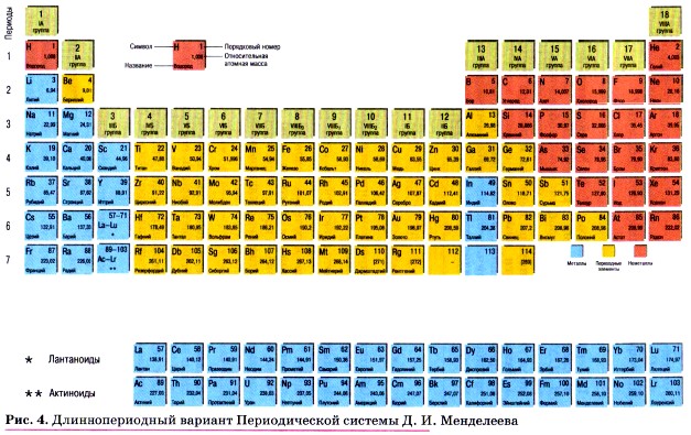 существовать более яркое доказательство справедливости учения о периодичности элементов, чем открытие до сих пор гипотетического экасилиция; оно составляет, конечно, более чем простое подтверждение смелой теории, — оно знаменует собой выдающееся расширение химического поля зрения, гигантский шаг в области познания» (К. Винклер). Американские учёные, открывшие элемент № 101, дали ему название «менделевий» в знак признания заслуг великого русского химика Дмитрия Менделеева, который первым применил Периодическую систему элементов для предсказания свойств тогда ещё не открытых элементов. Вы познакомились в 8 классе и будете пользоваться в этом году формой Периодической таблицы, которая называется короткопериодной. Однако в профильных классах и в высшей школе преимущественно используется другая форма — длиннопериодный вариант (рис. 4). Сравните их. Что общего и что различного в этих двух формах Периодической таблицы?