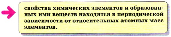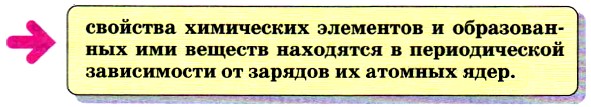 Систематизируя химические элементы на основе их относительных атомных масс, Д. И. Менделеев уделял большое внимание также свойствам элементов и образованных ими веществ, распределяя элементы со сходными свойствами в вертикальные столбцы — г р у п п ы. Иногда в нарушение выявленной им закономерности он ставил более тяжёлые элементы перед элементами с меньшими значениями относительных атомных масс. Например, он записал в свою таблицу кобальт перед никелем, теллур — перед иодом, а когда были открыты инертные (благородные) газы, аргон — перед калием. Такой порядок расположения Д. И. Менделеев считал необходимым потому, что иначе эти элементы попали бы в группы несходных с ними по свойствам элементов. Так, в частности, щелочной металл калий попал бы в группу инертных газов, а инертный газ аргон — в группу щелочных металлов. Д. И. Менделеев не мог объяснить эти исключения из общего правила, как и причину периодичности в изменении свойств элементов и образованных ими веществ. Однако он предвидел, что эта причина кроется в сложном строении атома. Именно научная интуиция Д. И. Менделеева позволила ему построить систему химических элементов не в порядке возрастания их относительных атомных масс, а в порядке возрастания зарядов их атомных ядер. О том, что свойства элементов определяются именно зарядами их атомных ядер, красноречиво говорит существование изотопов, с которыми вы знакомились в прошлом году (вспомните, что это такое, приведите примеры известных вам изотопов). В соответствии с современными представлениями о строении атома основой классификации химических элементов являются заряды их атомных ядер, и современная формулировка Периодического закона такова: