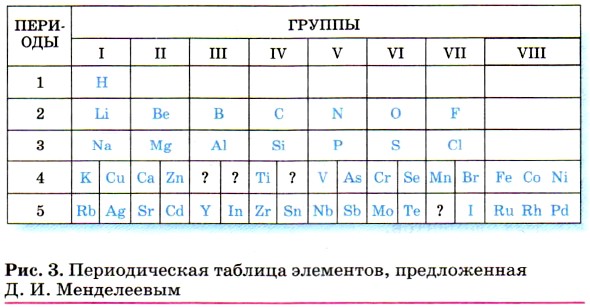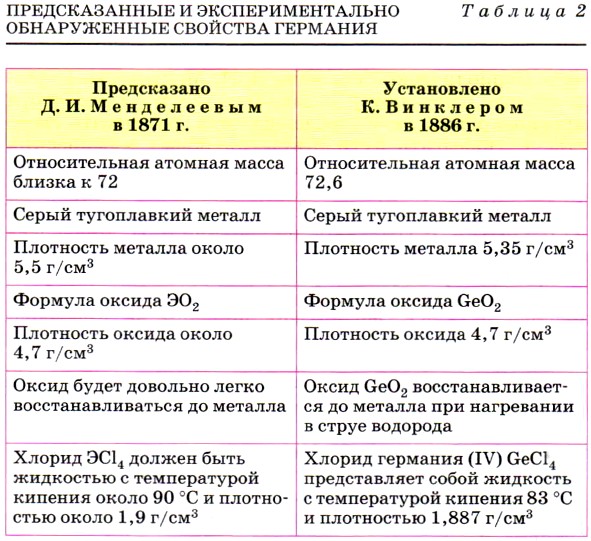 и причину сходства свойств элементов одной и той же группы. Эти два важнейших значения Периодического закона и Периодической системы Д. И. Менделеева дополняет ещё одно, которое заключается в возможности прогнозировать, т. е. предсказывать, описывать свойства и указывать пути открытия новых химических элементов. Уже на этапе создания Периодической системы Д. И. Менделеев сделал ряд прогнозов о свойствах ещё не известных в то время элементов и указал пути их открытия. В созданной им таблице Д. И. Менделеев для этих элементов оставил пустые клеточки (рис. 3). Яркими примерами прогностической силы Периодического закона явились последующие открытия элементов: в 1875 г. французом Лекоком де Буабодраном был открыт галлий, предсказанный Д. И. Менделеевым пятью годами раньше как элемент под названием «экаалюминий» (эка — следующий за); в 1879 г. шведом Л. Нильсоном был открыт «экабор» по Д. И. Менделееву; в 1886 г. немцем К. Винклером — «экасилиций» по Д. И. Менделееву (определите по таблице Д. И. Менделеева современные названия этих элементов). Насколько точен был в своих предсказаниях Д. И. Менделеев, иллюстрируют данные таблицы 2. Учёные-первооткрыватели новых элементов высоко оценили открытие русского учёного: «Вряд ли может