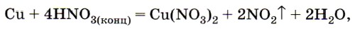 С металлами азотная кислота ведёт себя по-особому — ни один из металлов не вытесняет из азотной кислоты водород, независимо от её концентрации (для серной кислоты такое поведение характерно только в её концентрированном состоянии). Это объясняется тем, что HNO3 является сильным окислителем, в ней азот имеет максимальную степень окисления +5. Именно он и будет восстанавливаться при взаимодействии с металлами. Продукт восстановления зависит от положения металла в ряду напряжений, от концентрации кислоты и условий проведения реакции. Например, при взаимодействии с медью концентрированная азотная кислота восстанавливается до оксида азота (IV):