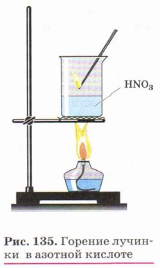 Железо и алюминий при действии концентрированной HNO3 покрываются прочной оксидной плёнкой, предохраняющей металл от дальнейшего окисления, т. е. кислота пассивирует металлы. Поэтому азотную кислоту, как и серную, можно перевозить в стальных и алюминиевых цистернах. Азотная кислота окисляет многие органические вещества, обесцвечивает красители. При этом обычно выделяется много теплоты и вещество воспламеняется. Так, если к азотной кислоте прилить каплю скипидара, то происходит яркая вспышка, а тлеющая лучинка в азотной кислоте загорается (рис. 135). Азотную кислоту широко применяют в химической промышленности для производства азотных удобрений, пластмасс, искусственных волокон, органических красителей и лаков, лекарственных и взрывчатых веществ (рис. 136). Соли азотной кислоты — нитраты получают при действии кислоты на металлы, их оксиды и гидроксиды. Нитраты натрия, калия, кальция и аммония называют селитрами: NaNO3 — натриевая селитра, KNO3 — калийная селитра, Ca(NO3)2 — кальциевая селитра, NH4NO3 — аммиачная селитра. Селитры применяют в качестве азотных удобрений.