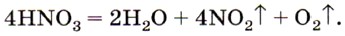 Азотная кислота HNO3. Это бесцветная жидкость, которая «дымится» на воздухе. При хранении на свету концентрированная азотная кислота желтеет, так как частично разлагается с образованием бурого газа NO2: