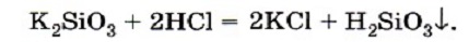 Силикаты натрия и калия называют растворимым стеклом. Их водные растворы — это хорошо известный силикатный клей. Из растворов силикатов действием на них более сильных кислот — соляной, серной, уксусной и даже угольной получается кремниевая кислота H2SiO3 (рис. 163):