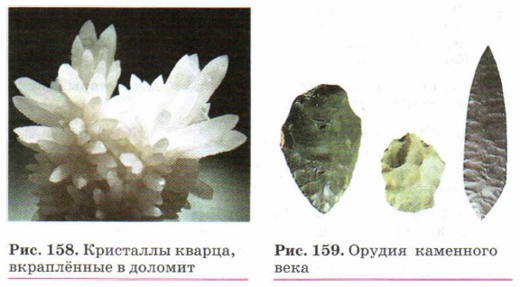 Второй представитель элементов главной подгруппы IV группы (IVА группы) Периодической системы Д. И. Менделеева — кремний Si. В природе кремний — второй по распространённости после кислорода химический элемент. Земная кора более чем на четверть состоит из его соединений. Наиболее распространённым соединением кремния является оксид кремния (IV) SiO2, другое его название — кремнезём. В природе он образует минерал кварц (рис. 158), многие разновидности которого — горный хрусталь и его знаменитая лиловая форма — аметист, а также агат, опал, яшма, халцедон, сердолик, известны как поделочные и полудрагоценные камни. Из оксида кремния (IV) состоят также обычный и кварцевый песок. Из разновидностей минералов на основе оксида кремния (IV) (кремня, халцедона и др.) первобытные люди изготовляли орудия труда. Именно кремень, этот невзрачный и не очень прочный камень, положил начало каменному веку — веку кремнёвых орудий труда (рис. 159).