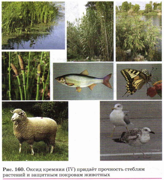 Причин этому две: распространённость и доступность кремня, а также его способность образовывать при сколе острые режущие края. Второй тип природных соединений кремния — это силикаты. Среди них наиболее распространены алюмосиликаты (понятно, что эти силикаты содержат химический элемент алюминий). К алюмосиликатам относят гранит, различные виды глин, слюды. Силикатом, не содержащим алюминия, является, например, асбест, из которого изготавливают огнеупорные ткани. Оксид кремния (IV) SiO2 необходим для жизни растений и животных. Он придаёт прочность стеблям растений и защитным покровам животных (рис. 160). Благодаря ему тростники, камыши и хвощи стоят крепко, как штыки, острые листья осоки режут, как ножи, стерня на скошенном поле колет, как иголки, а стебли злаков настолько крепки, что не позволяют ниве на полях ложиться от дождя и ветра. Чешуя рыб, панцири насекомых, крылья бабочек, перья птиц и шерсть животных прочны, так как содержат кремнезём. Соединения кремния придают гладкость и прочность волосам и ногтям человека. Кремний входит и в состав низших живых организмов — диатомовых водорослей и радиолярий, нежнейших комочков живой материи, которые создают свои непревзойдённые по красоте скелеты из кремнезёма (рис. 161).