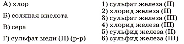 Ответы 1 и 2 следует отбросить, так как при окислении сероводорода и сульфида железа (II) образуется не SO3, a SO2. В варианте 3 первые два искомых вещества указаны верно, a CuCl2 — нет, поскольку эту соль превратить в оксид в одну стадию невозможно. Ответ: 4. 7. Установите соответствие между веществом, реагирующим с железом (левый столбец), и названием железосодержащего продукта, который при этом образуется (правый столбец).