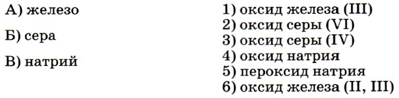 Задание выполнить несложно, так как из числа приведённых в условии реагентов только сильный окислитель — хлор окисляет железо до степени окисления +3 (соответствие А — 4). Остальные реагенты окисляют его до степени окисления +2. Ответ: 4251. 8. Установите соответствие между названием вещества (левый столбец) и названием продукта его горения (правый столбец).