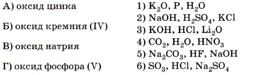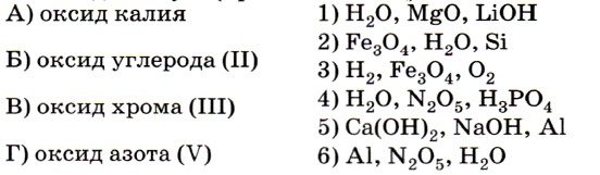 9. Установите соответствие между названием оксида (левый столбец) и формулами веществ, с которыми он может взаимодействовать (правый столбец).