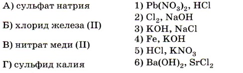 10. Установите соответствие между названием соли (левый столбец) и формулами веществ, с которыми она может взаимодействовать в водном растворе (правый столбец).