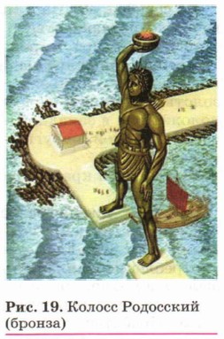 При выплавке меди человек однажды использовал не чистую медную руду, а руду, содержавшую одновременно и медь, и олово. В результате была получена бронза — сплав двух металлов: меди и олова, который гораздо твёрже своих компонентов. Наступил бронзовый век. Слово «бронза» произошло от названия небольшого итальянского городка Бриндизи на берегу Адриатического моря, который славился своими бронзовыми изделиями. В Египте уже в IV тысячелетии до н. э. умели примитивным способом получать бронзу. Из неё изготавливали оружие и различные декоративные изделия. У египтян, ассирийцев, финикийцев, этрусков литьё из бронзы достигло значительного развития. В VII в. до н.э., когда были разработаны способы отливки статуй из бронзы, наступает расцвет художественного применения бронзы. Гигантская бронзовая статуя Колосса Родосского (32 м) — ещё одно чудо света — возвышалась над входом во внутреннюю гавань древнего порта Родоса. Даже самые крупные морские суда свободно проходили под ней (рис. 19). Позже были созданы уникальные бронзовые творения: конная статуя Марка Аврелия, «Дискобол», «Спящий Сатир» и др. А великолепные бронзовые скульптуры «Медный всадник» и четыре скульптурные группы «Укрощение коня» на Аничковом мосту в Санкт-Петербурге — красноречивое свидетельство того, что бронза продолжает оставаться одним из основных материалов скульпторов.