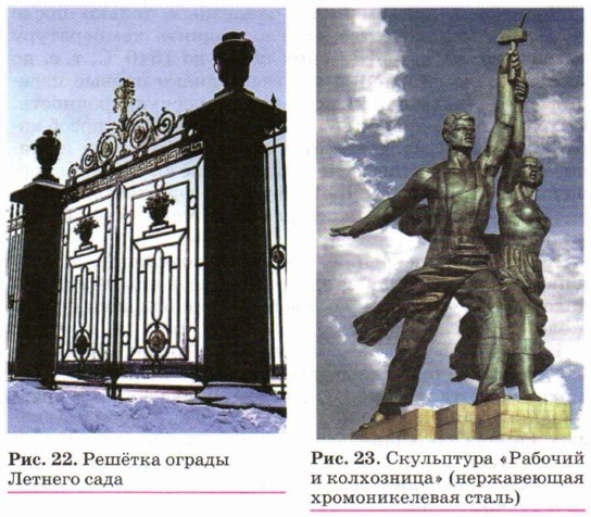 Знаменитые Царь-колокол и Царь-пушка в Московском Кремле — ещё два примера художественной ценности меди и её важнейшего сплава — бронзы (рис. 20 и 21). Бронзовый век сменился железным только после того, как человечество смогло поднять температуру пламени в металлургических печах до 1540 °С, т. е. до температуры плавления железа. Однако первые изделия из железа имели низкую механическую прочность. И только когда древние металлурги открыли способ изготовления из железных руд сплавов — чугуна и стали — более прочных, чем само железо, материалов, началось широкое распространение этого металла и его сплавов, стимулировавшее развитие человеческой цивилизации. Наступил железный век, который, очевидно, длится и по сей день, так как примерно 9/10 всех используемых человеком металлов и сплавов — это сплавы на основе железа. Изменилась и стоимость железа. В IX—VII вв. до н. э., когда начался железный век, этот металл ценился дороже золота. Именно с железом, а не с золотом сравнивали сердца выдающихся людей. Так, герои «Илиады» Гомера облачались в «меднокованые доспехи» и имели «сердца твёрдые, как железо», а героев его «Одиссеи», победителей игр, награждали куском золота и куском железа. С развитием металлургии стоимость железа снижалась, но всё более возрастала его роль в жизни человеческого общества. Железные сплавы — чугун и сталь — не только основа развития техники, но и важнейший материал искусства. Так, из чугуна отлит узор «кружев чугунных» Санкт-Петербурга, ограды его мостов и решётка Летнего сада (рис. 22). Великолепные произведения искусства из чугуна созданы мастерами Каслинского чугунолитейного завода. Вспомните хотя бы замечательную «Чугунную бабушку» П. Бажова. Знаменитый булат, из которого оружейники Дамаска, а затем и нашего Златоуста делали лучшие в мире клинки, — это сталь. Из стали тульские оружейники создавали непревзойдённое по качествам оружие. Из стали сделаны барельефы, светильники и опоры метро, а также скульптуры, например «Рабочий и колхозница» скульптора В. И. Мухиной (рис. 23).