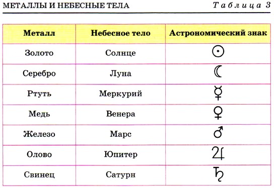 Семь металлов в древности соотносили с семью известными тогда планетами (табл. 3). Даже открытые в XIX в. палладий и церий были названы в честь небесных тел — астероидов Паллада и Церера.