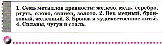 1. Назовите семь чудес света и укажите, какую роль играли металлы в их создании. 2. Какими из прилагательных можно описать свойства ртути при обычных условиях: а) твёрдая; б) жидкая; в) хрупкая; г) ядовитая; д) тягучая; е) блестящая; ж) прозрачная? 3. Какие свойства металлов или сплавов лежат в основе образования литературных выражений: «стальной характер», «железные нервы», «золотое сердце», «металлический голос», «свинцовый кулак»? 4. Какими из прилагательных можно воспользоваться для характеристики предгрозового неба: а) железное; б) магнитное; в) свинцовое; г) серебристо-белое; д) тяжёлое. 5. Подготовьте сообщение на тему «Использование металлов в искусстве». 6. Какую роль в истории человечества сыграли металлы?