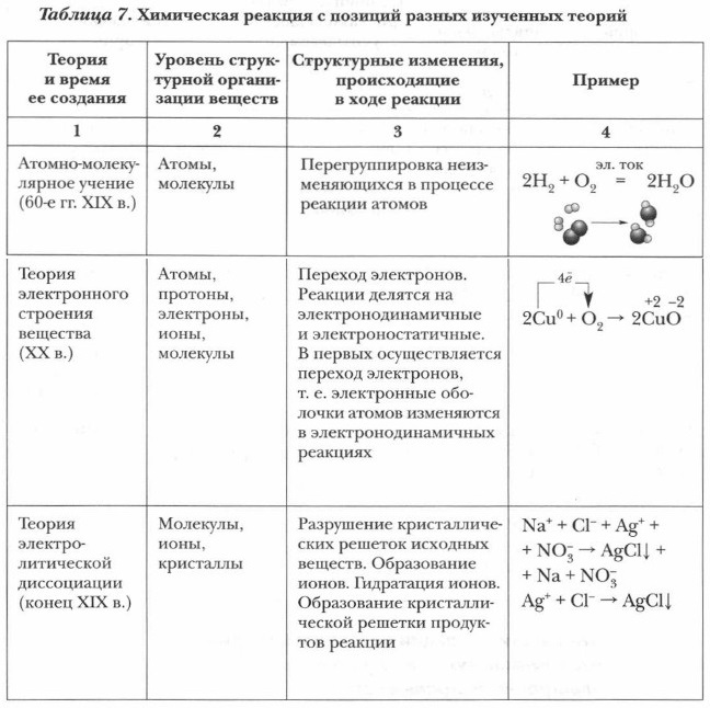 Дополнительный материал к главам 1 и 2 Химические реакции в свете трех теорий: атомно-молекулярного учения, электронного строения атома, теории электролитической диссоциацииМы познакомились с несколькими научными теориями, возникшими в разное время, сменившими друг друга или дополнившими и обогатившими одна другую. Посмотрим, как с позиций разных теорий рассматривается важнейшее понятие химии — химическая реакция (табл. 7).