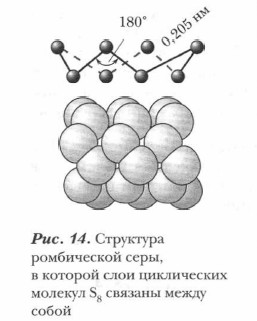 Физические и химические свойства халькогенов закономерно изменяются с увеличением порядкового номера элемента (Z). На их свойства влияет не только электронная структура атома и его радиус, но и тип кристаллической решетки вещества. Для халькогенов характерна аллотропия. Каждый из них имеет по нескольку аллотропных модификаций. Однако не все аллотропные модификации халькогенов устойчивы. Устойчивы при нормальных условиях (н. у.) у кислорода — газообразная форма, состоящая из двухатомных молекул O2; у серы — твердая ромбическая модификация с восьмиатомными циклическими молекулами S8 (рис. 14). У простых веществ элементов VIA-группы ярко, но в меньшей степени, чем у галогенов, выражены неметаллические свойства (табл. 13). Их химические свойства проявляются наиболее характерно в окислительно-восстановительных реакциях. В зависимости от другого реагента и условий протекания реакции они могут выступать в роли как окислителя, так и восстановителя.