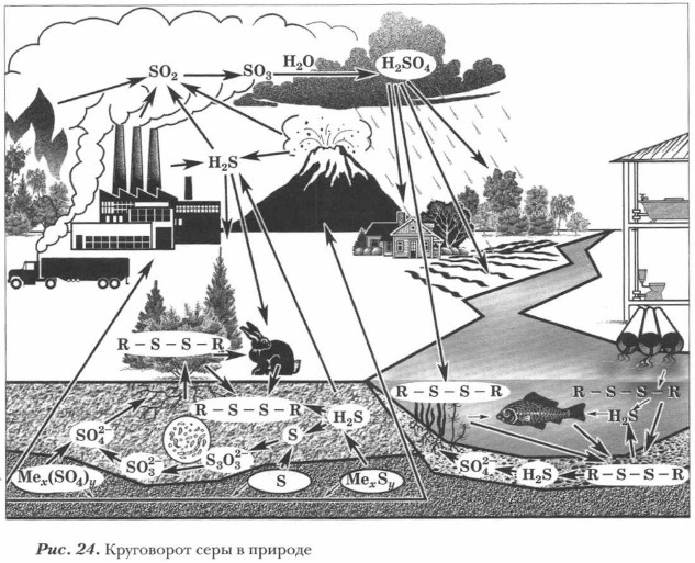 Повышение концентрации ядовитых соединений серы в водоемах резко ухудшает состав воды, изменяет растительный и животный мир водоемов, приводит к исчезновению рыб и другим экологическим проблемам. В обобщенном виде круговорот серы в природе представлен на рис унке 24, который отражает и экологический аспект этого круговорота (обозначение R—S—S—R означает серу в составе органических соединений). Творческое задание