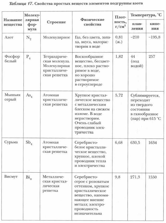 Глава 5. Подгруппа азота и ее типичные представители Общая характеристика элементов подгруппы азотаПростые вещества. Некоторые простые вещества элементов VA-группы, особенно фосфор и мышьяк, имеют несколько аллотропных модификаций. Сравнение свойств простых веществ элементов подгруппы азота также отражает закономерное изменение их свойств с увеличением порядкового номера элемента (см. табл. 17).