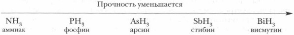 Водородные и кислородные соединения. Сходное строение внешнего электронного слоя атомов элементов подгруппы азота (ns2np3) приводит к образованию сходных форм их водородных и кислородных соединений, в которых их атомы проявляют степени окисления от -3 до +5. Они образуют газообразные водородные соединения формы RHS. В подгруппе азота свойства водородных соединений изменяются с увеличением порядкового номера элементов также закономерно: