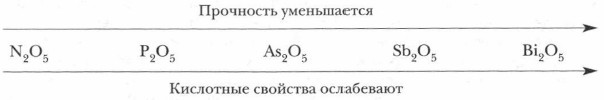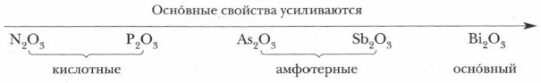 У соединений элементов подгруппы азота со степенью окисления +3 с увеличением порядкового номера элемента более активно по сравнению с соединениями со степенью окисления +5 проявляются основные свойства. Рассмотрим эту закономерность на примере оксидов: