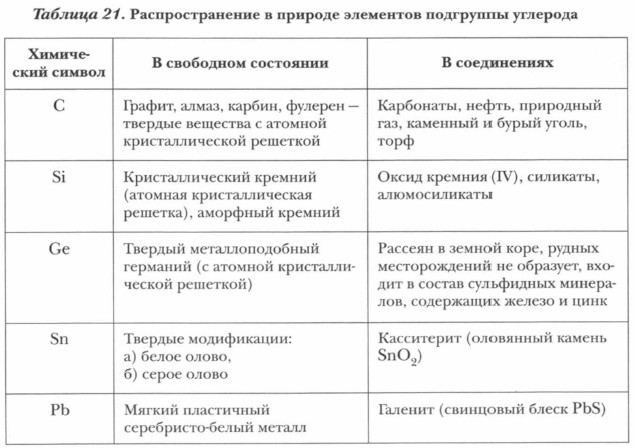 Обратимся к периодической системе химических элементов Д.И. Менделеева. В IVA-группу входят: углерод, кремний, германий, олово, свинец. Эти элементы составляют подгруппу углерода (табл. 21). Они являются самыми интересными и своеобразными по химическим свойствам элементами, так как расположены в середине периодической системы химических элементов и находятся на границе между металлами и неметаллами. История науки не знает имен первооткрывателей углерода, олова, свинца, применяемых с доисторических времен.