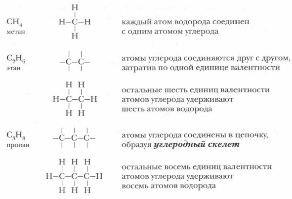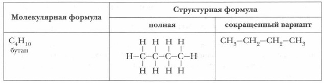 В приведенных выше формулах изображен порядок соединения атомов в молекулах, т. е. показана только последовательность соединения атомов, а не расположение атомов в пространстве. Они называются формулами строения или структурными формулами. Такими формулами неудобно пользоваться при записи уравнений химических реакций, поэтому часто используют сокращенный вариант структурных формул:
