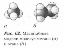 В молекуле этана семь ковалентных связей: шесть из них связи С—Н и одна С—С. Все они σ-связи. Атомы углерода в этане, как и в метане, находятся в sp3-гибридизованном состоянии (рис. 60). Валентные углы между связями близки к тетраэдрическим (109°28'). Поэтому углеродный остов молекулы предельного углеводорода имеет не линейное, а зигзагообразное строение. Зигзагообразная цепь атомов углерода может принимать различные пространственные формы. Это связано с тем, что атомы в молекулах предельных углеводородов могут свободно вращаться вокруг σ-связей (рис. 61). Такие модели углеводородов называются шаростержневыми.