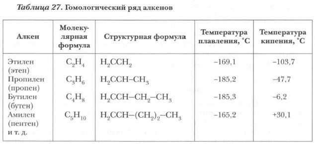 По международной номенклатуре непредельные углеводороды этиленового ряда называются алкенами. Простейшим представителем алкенов является этилен С2Н4. Как и метан, этилен начинает гомологический ряд алкенов (табл. 27).