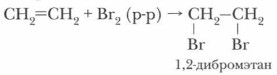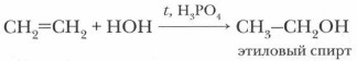 Реакция присоединения брома является качественной реакцией на алкены и на другие непредельные углеводороды: происходит обесцвечивание красно-бурой окраски бромной воды. Второй реактив на непредельные углеводороды — раствор перманганата калия КМnО4. Его малиновая окраска обесцвечивается от действия этилена. 4. Присоединение воды — реакция гидратации. В качестве катализатора берется фосфорная кислота на твердом носителе:
