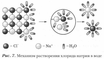 Глава 2. Растворы. Теория электролитической диссоциации Ионы — переносчики электрических зарядовЗадание. Вспомните особенности строения молекул воды (полярная связь, угловое строение, дипольный характер) и рассмотрите рисунок 7, изображающий механизм растворения хлорида натрия NaCl в воде. Попробуйте объяснить механизм разрушения ионного кристалла в воде — полярном растворителе.