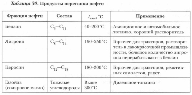 Дополнительный материал к § 39-41 Природные источники углеводородов. Нефть. НефтепродуктыПриродными источниками углеводородов — ценнейшего сырья для современного органического синтеза — являются природный и попутный нефтяные газы, нефть, каменный уголь. Более 90 % углеводородов, добываемых из природных источников, сжигается в топках тепловых электростанций, двигателях внутреннего сгорания. Это большое расточительство. Еще в прошлом веке Д.И. Менделеев говорил: «Нефть — не топливо. Топить можно и ассигнациями». Природные углеводороды — ценное сырье для химической промышленности. Подробно мы рассмотрим один из важнейших источников углеводородов — нефть. Физические свойства. Нефть — маслянистая жидкость от светло-бурого до почти черного цвета с характерным запахом. Она немного легче воды (ρ = 0,73-0,97 г/см3) и практически в ней не растворяется. Нефть — это сложная смесь различных углеводородов, в основном жидких (в них растворены твердые и газообразные углеводороды). Поэтому нефть не имеет постоянной температуры кипения. Состав нефтей неодинаков, соотношение углеводородов в нефтях различно и зависит от месторождения. Например, бакинская нефть богата циклоалканами, грозненская — предельными углеводородами. Кроме углеводородов нефть содержит органические соединения, в составе которых находятся кислород, сера, азот. Нефтепродукты и их применение. Сырая нефть обычно не применяется. Она широко используется как источник химического сырья. Из нее получают вещества, необходимые для производства пластмасс, синтетического волокна, синтетического каучука, спиртов, кислот, синтетических моющих средств, взрывчатых веществ, ядохимикатов и т. п. Для получения ценных продуктов на нефтеперерабатывающих заводах нефть подвергают переработке. Сначала производят первичную переработку нефти, перегонку. Она основана на физическом свойстве углеводородов нефти — разной температуре кипения. Нефть разделяют на отдельные фракции. При перегонке нефти получают светлые нефтепродукты (табл. 30).