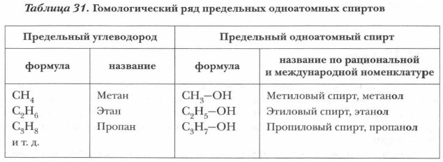 По рациональной номенклатуре — от названий соответствующих радикалов — метиловый спирт СН3ОН и др. (табл. 31).