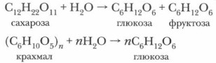 Глюкоза С6Н12О6 — бесцветное кристаллическое вещество, хорошо растворяющееся в воде, сладкое на вкус. Она содержится в плодах, корнях, листьях, цветах. Особенно много глюкозы в спелых ягодах и фруктах. Глюкоза присутствует в крови человека и животных. Она всасывается из кишечника в кровь и разносится по всему организму, при этом происходит окисление глюкозы с освобождением энергии: С6Н12О6 + 6O2 → 6СО2 + 6Н2O + Q Избыток глюкозы запасается в клетках печени и мышц в виде гликогена. В период интенсивной работы мышц расщепление гликогена усиливается, снова образуется глюкоза. Сахароза С12Н22О11 (свекловичный или тростниковый сахар) — бесцветное кристаллическое вещество, как и глюкоза, хорошо растворяющееся в воде, сладкое на вкус. Крахмал (С6Н10О5)n — белый порошок, нерастворимый в холодной воде. В горячей воде набухает и образуется крахмальный клейстер. Крахмал содержится в растительных организмах: клубни картофеля содержат около 20% крахмала, зерна пшеницы и кукурузы — 70 %, риса — 80 %. Крахмал — ценное питательное вещество. В организме под действием ферментов (биологических катализаторов) сахароза и крахмал подвергаются гидролизу с образованием глюкозы: