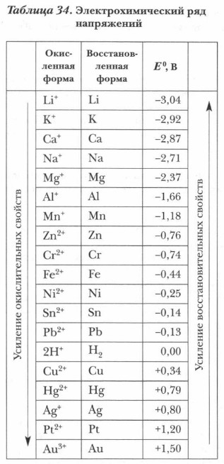 в) уменьшение способности металлов переходить в водных растворах электролитов в гидратированные ионы. Электрохимический ряд напряжения металлов (см. табл. 34) служит важной ориентировочной основой для определения возможностей протекания окислительно-восстановительных реакций металлов, их направлений, для составления уравнений этих реакций. Поэтому важно научиться правильно использовать его в своей учебной работе. Для применения ряда напряжений следует знать ряд положений по его использованию и границы применения этого ряда. Электрохимический ряд напряжений металлов в качественном и количественном плане отражает последовательное изменение электрохимических свойств металлов и сопряженных с ними ионов. Он используется для определения принципиальной возможности протекания окислительно-восстановительных реакций металлов (с растворами кислот и солей). При этом важно учитывать следующие положения: