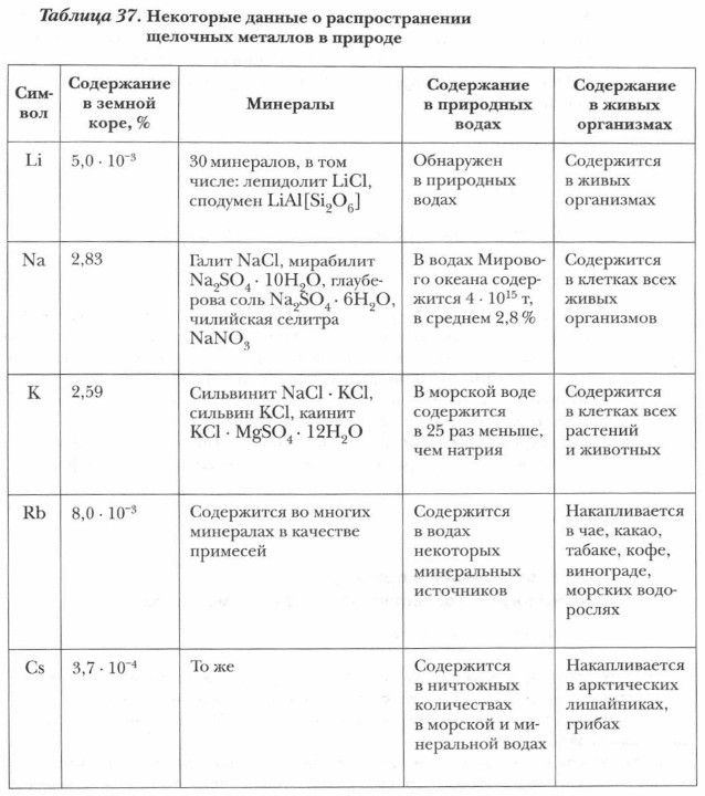 Дополнительный материал к § 50 Распространение в природе и биологическое значение щелочных металловХарактер распределения щелочных металлов в природе обусловлен их химической активностью и хорошей растворимостью в воде многих их соединений (табл. 37).