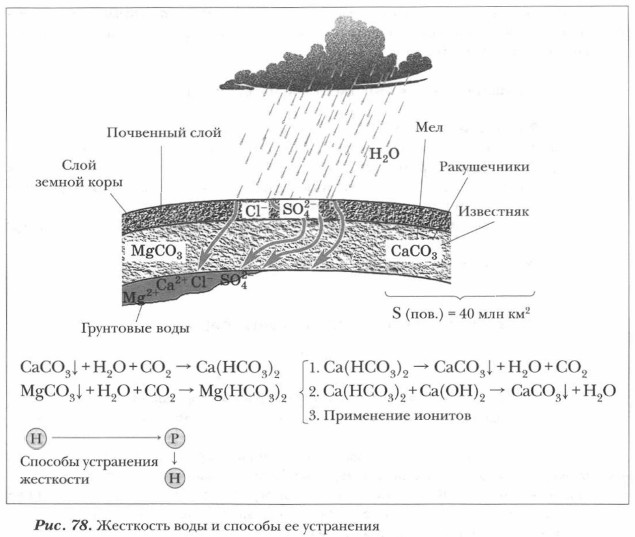 Часть дождевых вод превращается в грунтовые воды. Они, в свою очередь, протекая в недрах Земли, соприкасаются с минералами кальция и магния, вымывая из них мелкие частички. В воде, насыщенной углекислотой (каковы источники С02, как происходит это насыщение?), нерастворимые карбонаты кальция и магния (средние соли) растворяются, так как превращаются в кислые соли (см. уравнения 1 и 2 на рис. 78). В таком растворимом виде гидрокарбонаты металлов остаются в воде и обусловливают ее временную жесткость. При кипячении воды гидрокарбонаты разлагаются и выпадают в осадок (вспомните накипь на стенках чайника). Нарастание таких осадков на стенках паровых котлов, труб неминуемо ведет к авариям. Это является серьезной причиной необходимости устранения жесткости воды. Помимо временной, существует еще так называемая постоянная жесткость, обусловленная присутствием в природной воде растворимых хлоридов и сульфатов кальция и магния. Основные понятия Жесткость воды: временная, постоянная Вопросы и задания