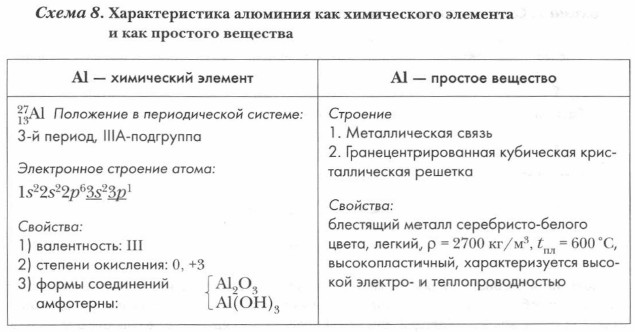 Алюминий — один из наиболее распространенных в природе элементов. На его долю приходится 8,13% массы земной коры. В основном он сосредоточен в минералах, называемых алюмосиликатами. К их числу относятся как обыкновенные глины и слюда, так и замечательные драгоценные камни, такие как гранат, берилл, топаз. Обратитесь к схеме 8, где дана характеристика алюминия. Важнейшими минералами алюминия, имеющими промышленное значение, являются бокситы (Аl2O3 • Н2O), криолит (Na3AlF6.) и др.