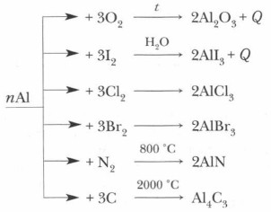 На поверхности алюминия тонкая и прочная, но отслаивающаяся при механическом воздействии (сгибании — разгибании) пленка. Ее толщина всего 0,00001 мм, но она надежно защищает металл от атмосферных воздействий, обеспечивая высокую коррозионную устойчивость. Химические свойства алюминия1. Отношение к простым веществам: