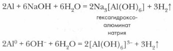 После удаления оксидной пленки алюминий активно взаимодействует со щелочами, образуя комплексные соединения (гексагидроксоалюминаты). Сущность процесса взаимодействия алюминия со щелочью можно выразить следующим уравнением реакции: