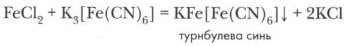Реактивом на ионы Fe2+ служит гексацианоферрат(III) калия, или красная кровяная соль K3[Fe(CN)6], При их взаимодействии выпадает темно-синий осадок турнбулевой сини: