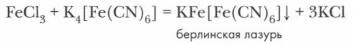 Применяют для этого также желтую кровяную соль — гексацианоферрат(II) калия K4[Fe(CN)6], при этом образуется синий осадок берлинской лазури: